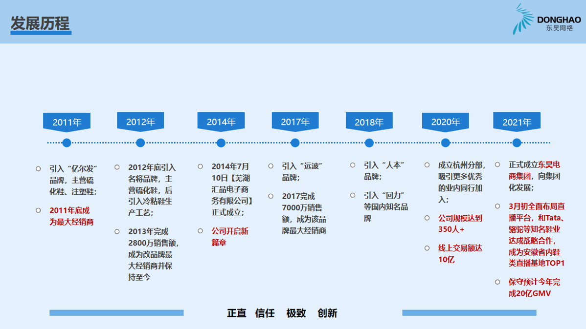 蕪湖東昊網絡科技有限公司,成立于 2014 年,是一家以互聯(lián)網平臺銷售為核心的電子商務運營商,公司成立以來,始終專注于休閑運動鞋的互聯(lián)網銷售業(yè)務,產品線覆蓋硫化鞋、注塑鞋、冷粘鞋,在互聯(lián)網二級類目單品牌排名前三,綜合成績排名TOP1;